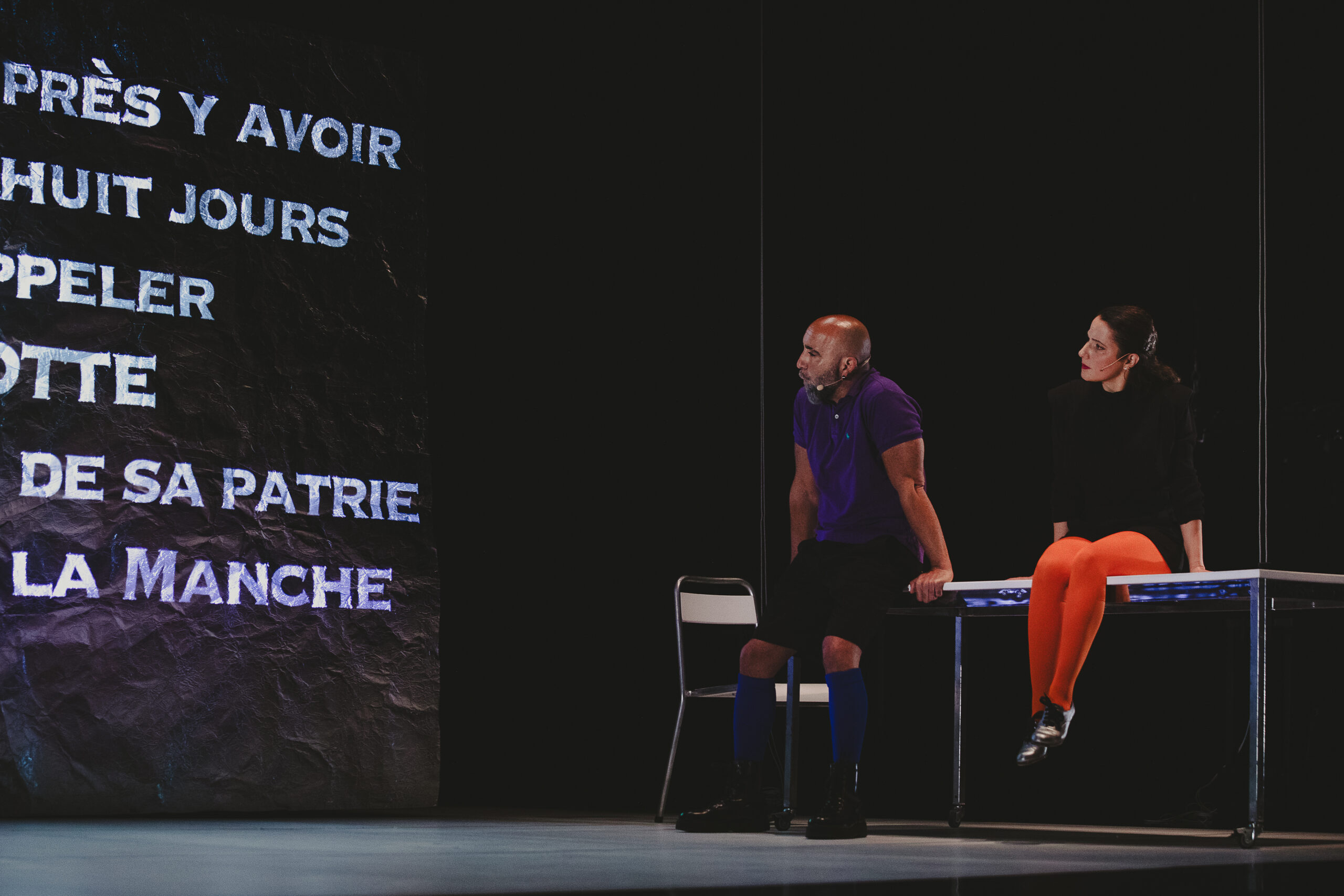 L’univers sonore, en collaboration avec Joan Cambon, nous baigne dans le sombre et l’allégresse, le cliquetis rythmique des armures et des combats et l’univers lunaire du rêve et de la nuit, le flamenco et la musique électronique, la musique des machines et celle de nos corps. L’espace visuel oscille entre, un On-Off, que j’affectionne particulièrement, reflet de la dualité qui traverse le chef d’œuvre de Cervantes.